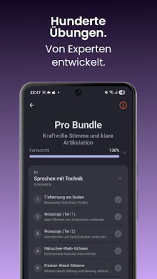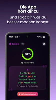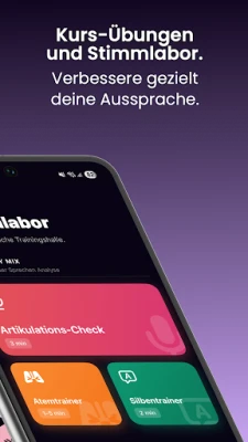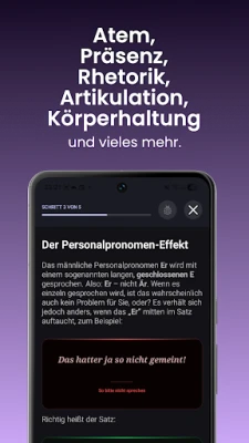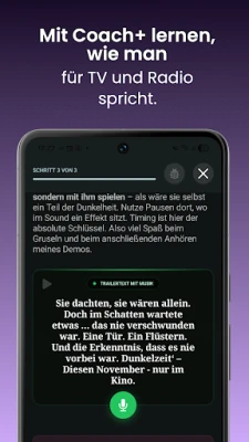 S viac ako 500 prepracovanými cvičeniami, nahovorenými skúsenými odborníkmi z oblasti televízie, rádia a logopédie, budete cielene pracovať na sile hlasu, artikulácii, dychovej technike, rečníckom prejave a celkovom výraze. Objavte úplne nové Stimmlabor, kde nájdete špecializované nástroje ako kontrolu artikulácie, dychový tréner, nácvik tempa a intonácie, silabické cvičenia, či dokonca improvizáciu príbehov. Táto sekcia je perfektná pre rodených hovoriacich aj pre tých, ktorí si chcú zdokonaliť svoju nemčinu ako druhý jazyk. Pre pokročilých užívateľov a profesionálov sú pripravené exkluzívne kurzy Coach+, ktoré ponúkajú špecifické tréningy a cenné tipy priamo od mediálnych expertov, ideálne pre reklamu, podcasty či dabing.