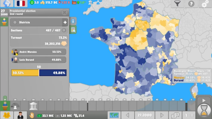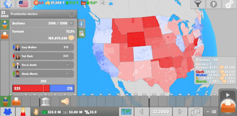 Predstavte si svet, kde každé rozhodnutie formuje osud národa. Ponorte sa do hlbokej politickej simulácie, ktorá vám otvára dvere do komplexného sveta vládnutia. Objavte a experimentujte s rozličnými politickými systémami, od jednoduchých väčšinových modelov až po prepracované proporčné zastúpenie podľa d'Hondtovej metódy, a pochopte nuansy, ktoré ovplyvňujú výsledky volieb a stabilitu štátu. Táto hra vám dáva príležitosť nielen sledovať, ale aktívne kreovať budúcnosť.