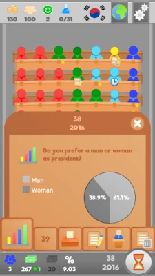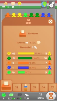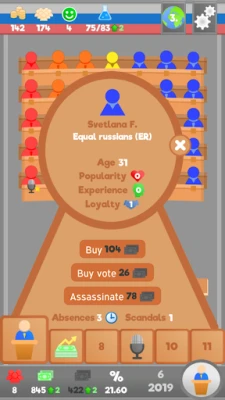 Ponorte sa do vzrušujúceho sveta politiky, kde každé rozhodnutie formuje osud národa. V tejto prepracovanej simulácii prevezmete úlohu lídra ambicióznej politickej strany. Vaša cesta za mocou začína u občanov: formulujte sľuby, ktoré rezonujú s ich túžbami, a presvedčte ich, že vaša vízia je tou správnou pre budúcnosť krajiny. Len s dostatočnou podporou sa vaša strana dostane do parlamentu, kde sa začína skutočný boj o vplyv a smerovanie štátu. Je čas ukázať vaše strategické myslenie a charizmu.